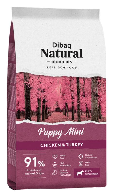 Dibaq Natural Moments Puppy Mini (Курица, индейка) – полнорационный корм для щенков и сук мелких пород в период лактации. Рецепт еды с натуральными антиоксидантами, средствами защиты суставов и без ГМО.