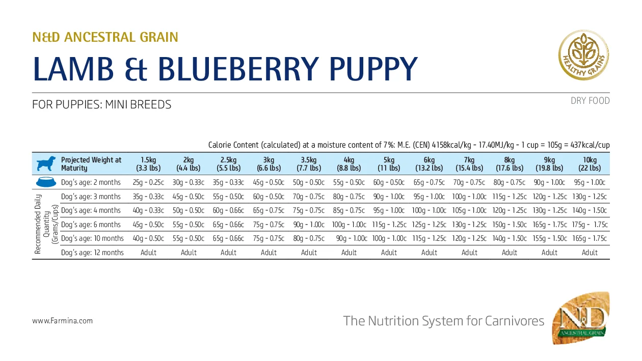 Farmina N&D Ancestral Grain Puppy Mini (Ягненок и черника) - это сбалансированный низкозерновой рацион, созданный специально для щенков мелких пород, а также беременных и кормящих сук. В основе корма свежее мясо ягненка без костей, овощи и черника, наполняющие организм всеми необходимыми витаминами и минералами.
