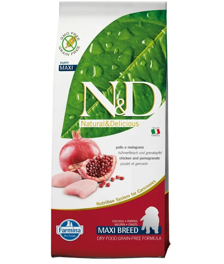 Farmina N&D Prime GF Puppy Maxi (Курица и гранат) — беззерновой корм для щенков крупных пород.