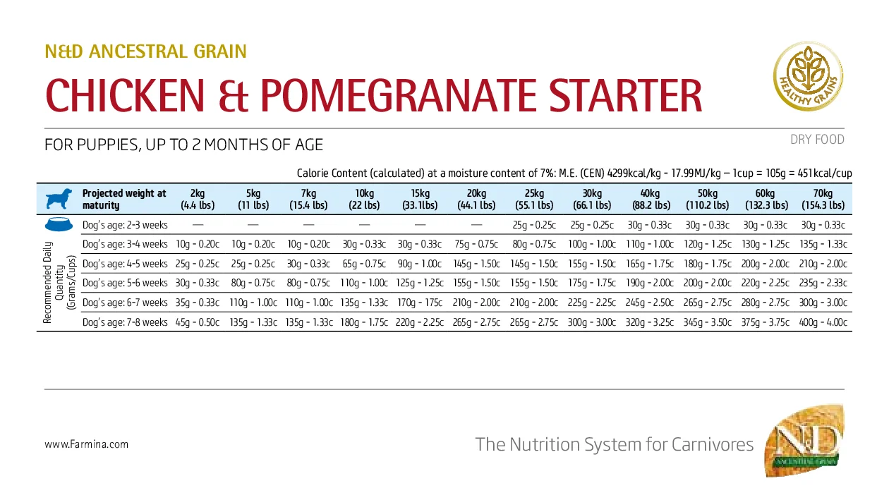Farmina N&D Ancestral Grain Puppy Starter (Курица и гранат) - полнорационный корм с низким содержанием зерна для щенков с момента отъема до 2 месяцев.