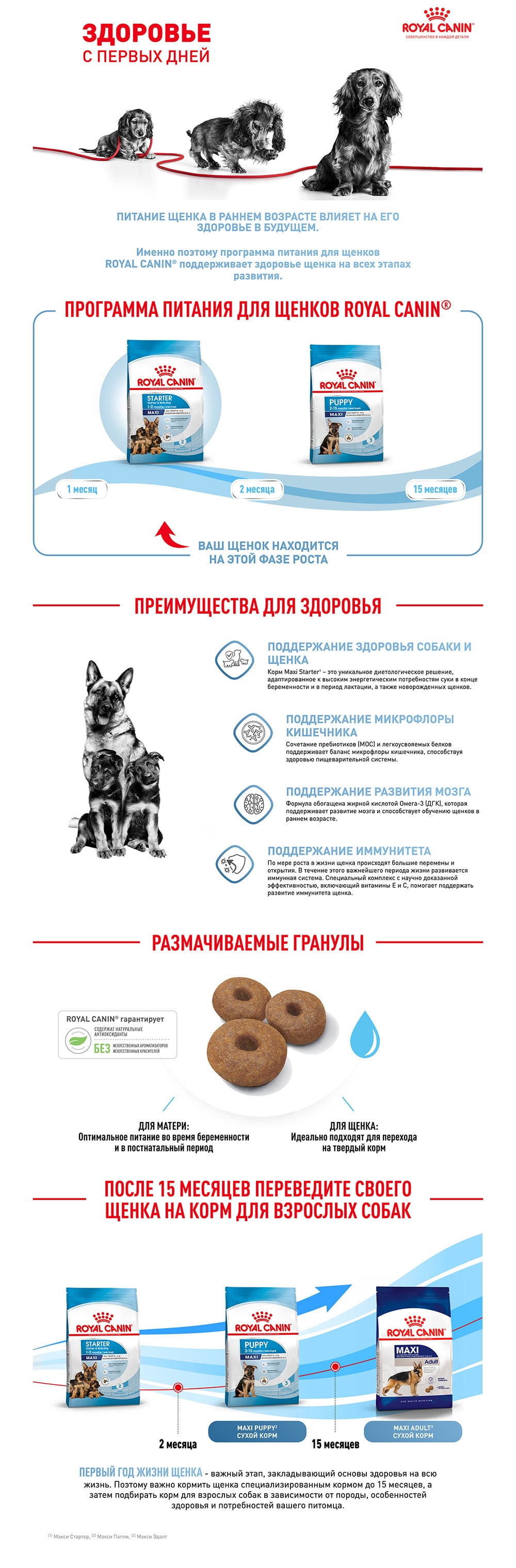 Royal Canin Maxi Starter - сухой корм для собак в период беременности и лактации, а также для щенков в период отъема от матери и до 2-х месячного возраста. Maxi Starter – полнорационный продукт для собак крупных размеров (весом от 26 до 44 кг).