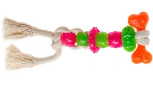 Игрушка состоит из двух частей: красочные элементы и канат из хлопка. Игрушка-канат с элементами для поддержания здоровья зубов и десен собак.