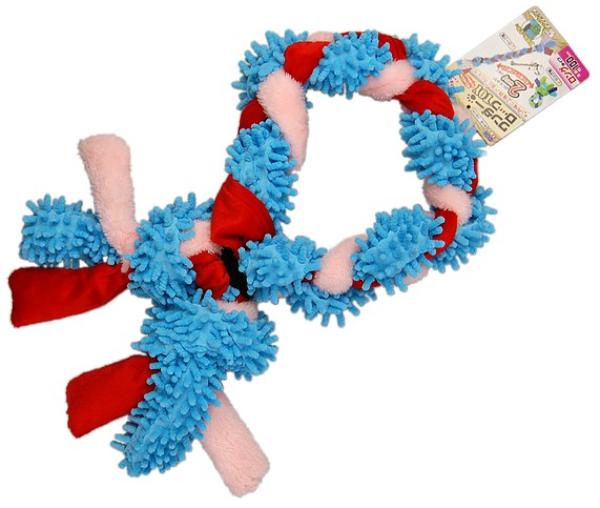 Прочные материалы позволяют использовать игрушку по принципу «перетягивания каната», а разветвления со встроенным шуршащим материалом и пищалками сделают ее любимой для самостоятельной игры.