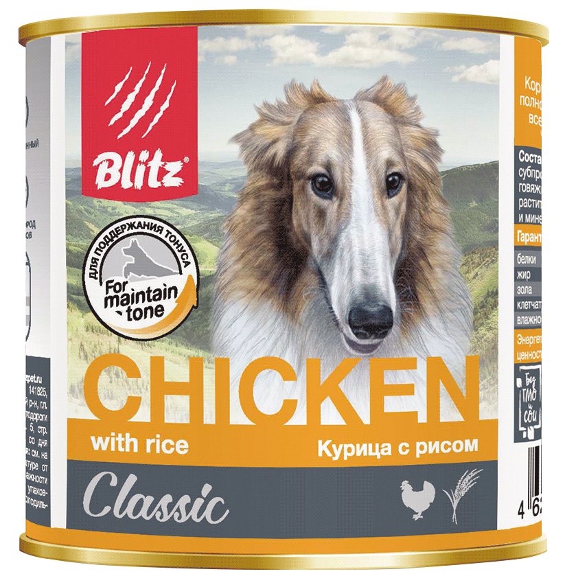 BLITZ Classic Dog Курица, рис - мясо курицы, говядина и рис составляют основу сбалансированного полнорационного корма для собак Blitz. Благодаря рису, который является источником медленных углеводов и высвобождает энергию плавно, данная формула поддерживает жизненный тонус и повышает выносливость собаки, позволяет питомцу находится в активной жизненной фазе на протяжении всего дня, восстанавливая его силы и активность. Комплекс натуральных витаминов и минералов ежедневно обеспечит вашего питомца всем необходимым для здоровья и полноценной жизни. Корм имеет консистенцию крупнорубленного паштета.
