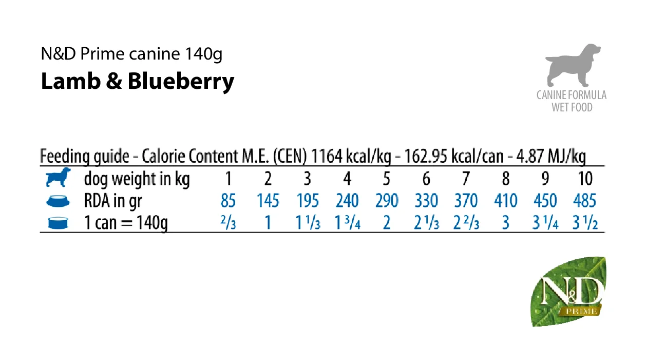 Консервы Farmina N&D Prime Dog Adult Mini (Ягненок, черника) - это беззерновой полнорационный влажный корм в небольшой банке для собак со вкусом ягненка и черники.