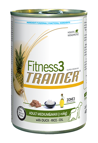 Trainer Fitness Adult Medium/Maxi Duck & Rice, 0,4 кг - это монопротеиновый корм для взрослых собак средних и крупных пород. В основе консервов - мясо утки, рис и растительное масло. Утятина является единственным источником белка животного происхождения. Рис - единственный источник углеводов, а подсолнечное масло - жиров растительного происхождения.