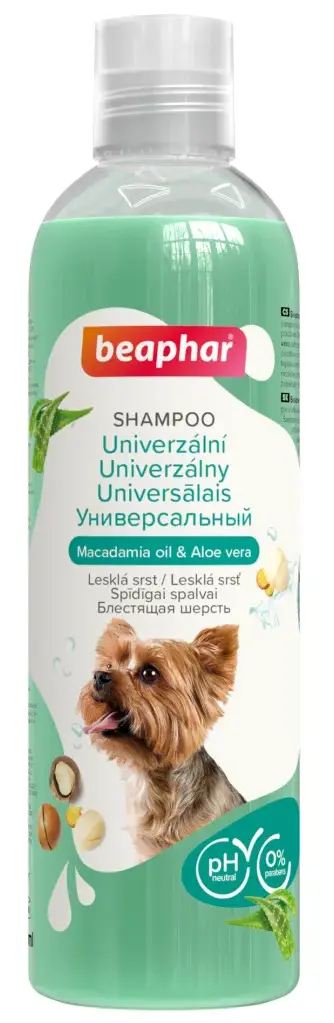 Beaphar Шампунь Universal Macadamia oil & Aloe vera 250 мл — мягкий шампунь для собак имеет нейтральный рН, идеально подходит для регулярного использования для всех типов шерсти и пород собак. Средство обогащенное маслом ореха Макадамия и экстрактом Алоэ вера, благодаря чему придает шерсти мягкости и блеска, делает его свежим и чистым.