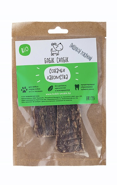 Бобик-Снобик пищевод говяжий - натуральное лакомство, высушенное в виде мясных пластинок.