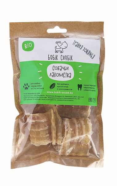 Бобик-Снобик трахея говяжья (колечки) - натуральное сушеное лакомство для собак, богатое витаминами и минералами. Трахея, резаная колечками, диаметром 3-5 см и длиной 2-3 см, порадует собак всех пород и возрастов, а также отлично подойдет для дрессуры.