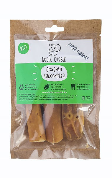 Бобик-Снобик аорта говяжья - натуральное сушеное лакомство для собак с высоким содержанием аминокислот и микроэлементов. Благодаря высокому содержанию белка говяжья аорта положительно влияет на состояние кожи и шерсти собаки.