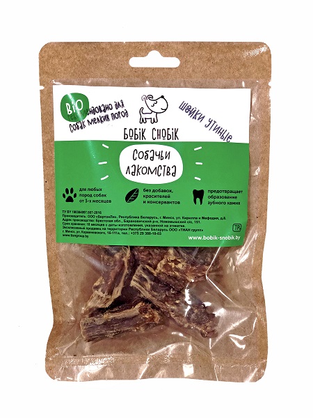 Бобик-Снобик шейки утиные мелкой нарезки - это лакомство для собак мелких пород.