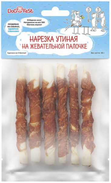 Dog Fest Нарезка утиная на жевательной палочке — аппетитное лакомство для собак из отборного мяса, изготовленное на 100% из натуральных ингредиентов.