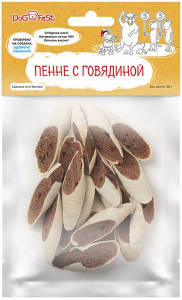 Dog Fest Пенне с говядиной — аппетитное лакомство для собак из отборного мяса, изготовленное на 100% из натуральных ингредиентов.