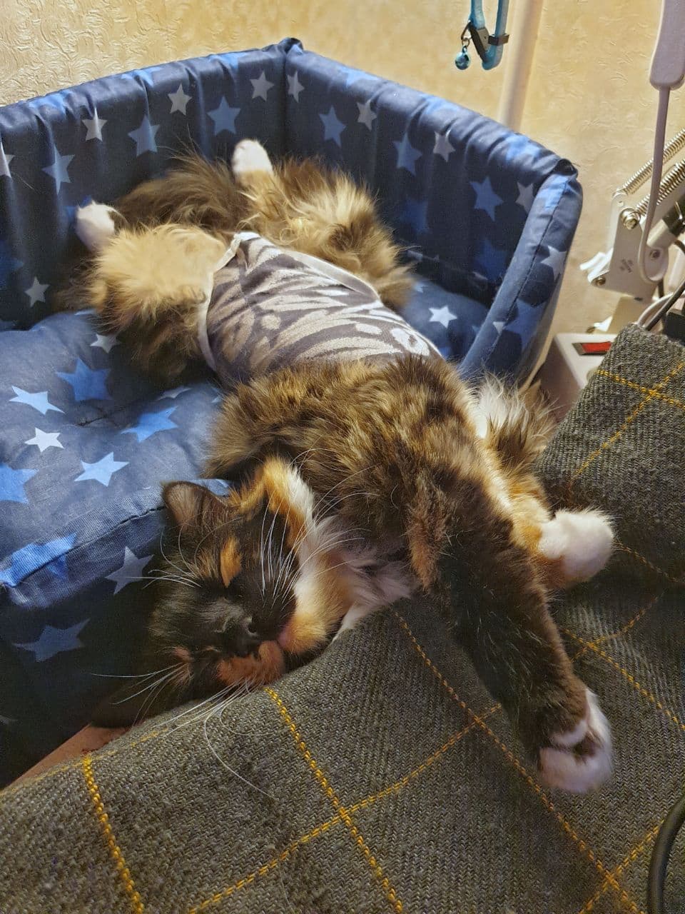 Изделие с высоким бортом имеет отделку из яркой и практичной бязи, съемную подушку в комплекте и круглую выемку при входе высотой 13 см.