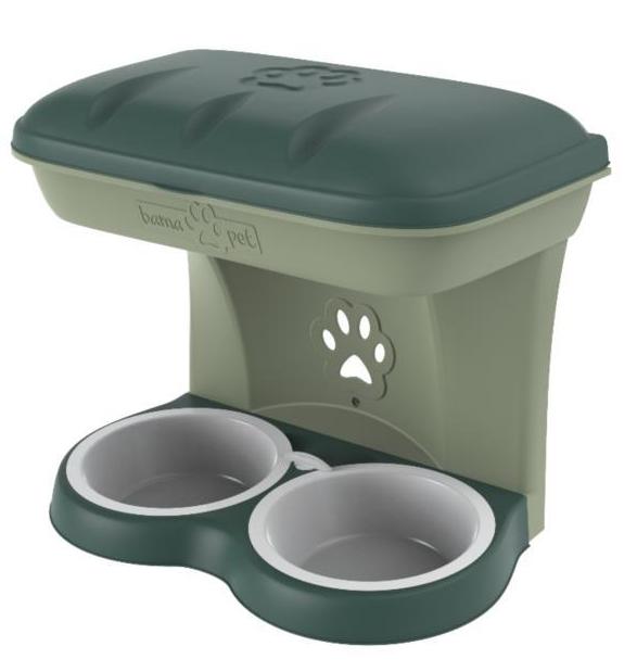 Комплект состоит из двух чаш, специальным отсеком с закрывающейся крышкой для предметов первой необходимости. Перед установкой подставки на стену рекомендуется измерить высоту собаки в холке и только после этого окончательно закрепить.