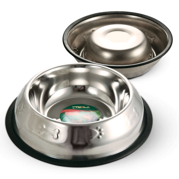 Triol Миска металлическая с тиснением на резинке - это качественная миска, сделанная из нержавеющей стали. Она подходит для воды и кормов разной консистенции, легко моется под струей воды с использованием моющих средств.