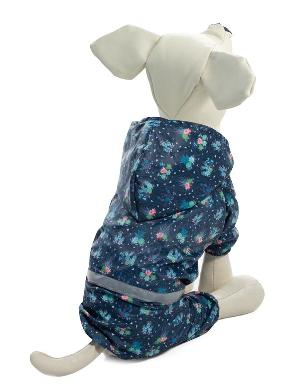 Особенностью дождевика является светоотражающая лента, идущая по талии изделия, - для повышения безопасности животного на дороге. Дождевик также имеет капюшон и фиксируется при помощи трех заклепок на животе, а на штанинах предусмотрены удобные резинки, препятствующие попаданию грязи и влаги снизу.