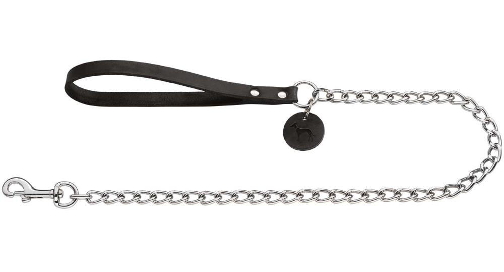Прочный и устойчивый к атмосферным воздействиям поводок-цепочка универсален, его удобно держать в руке благодаря петле из износостойкой мягкой натуральной кожи.