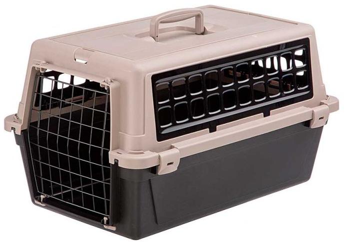 Изготовлена из прочного пластика, со стальной дверцей, решетка которой имеет пластиковое покрытие, закрывается снаружи и фиксируется на месте с помощью защелок. Удобная ручка на верхней части облегчает процесс переноски.