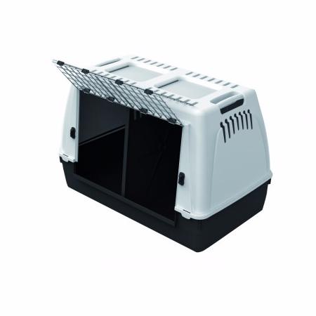 Переноска сделана из нетоксичного пластика, ударопрочного и не пропускающего УФ-лучей. Большая маталлическая дверца легко закрывается и открывается. Для комфорта питомца есть вентиляционные цели.