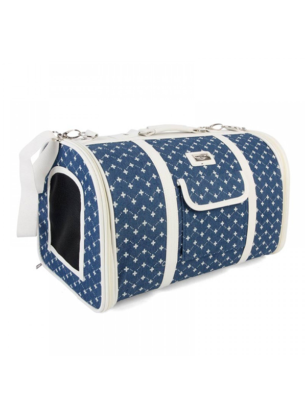 Она сделана из плотной джинсовой ткани, имеет жесткий каркас, который сохраняет форму. Переноска застёгивается с помощью замка-молнии, имеет два входа и два вентиляционных окошка из плотной сетки.