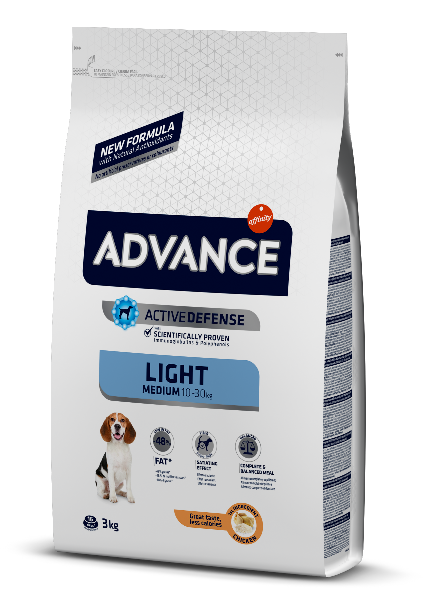 Advance Dog Medium Light - это высококачественный сбалансированный специально разработанный корм для собак средних пород (от 10 кг до 30 кг), которые имеют избыточный вес и риск ожирения.