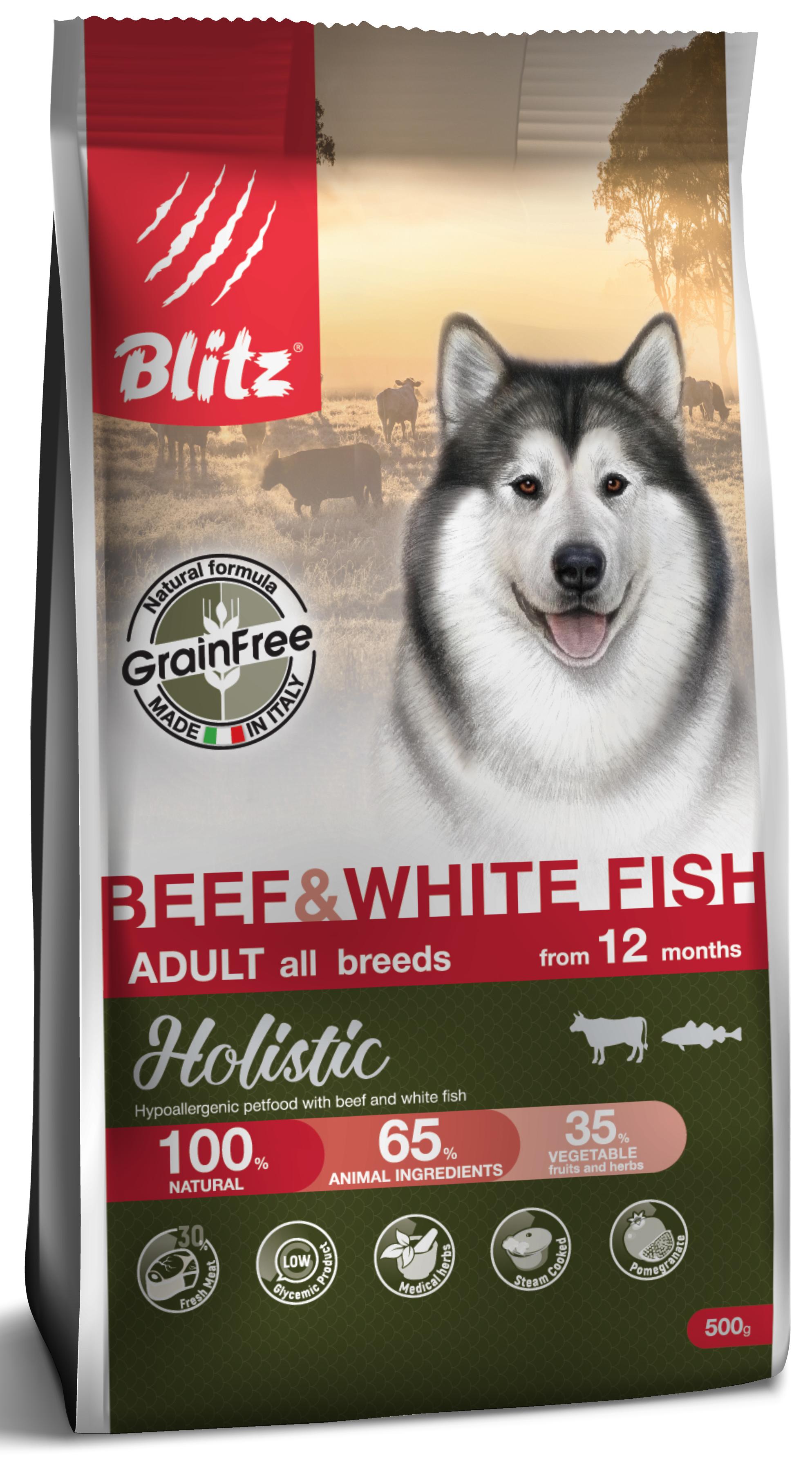 BLITZ Holistic GF Adult (Говядина, белая рыба) - это беззерновой корм для взрослых собак всех пород, полнорационное питание для поддержания здоровья вашей собаки. Сочетание красного мяса говядины и белой рыбы составляют основу корма.