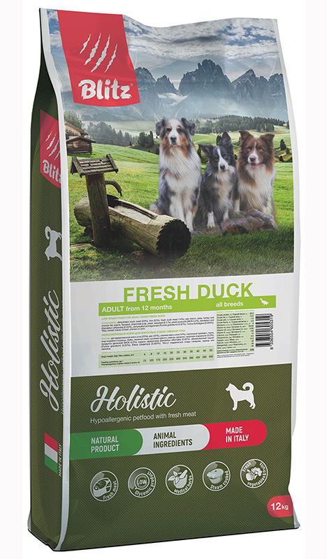 BLITZ Holistic LG Adult (Свежая утка) - это полнорационный низкозерновой сухой корм-холистик для взрослых собак всех пород максимально приближен к естественному питанию плотоядных. Благодаря входящим в состав ингредиентам, способствует укреплению здоровья собак.