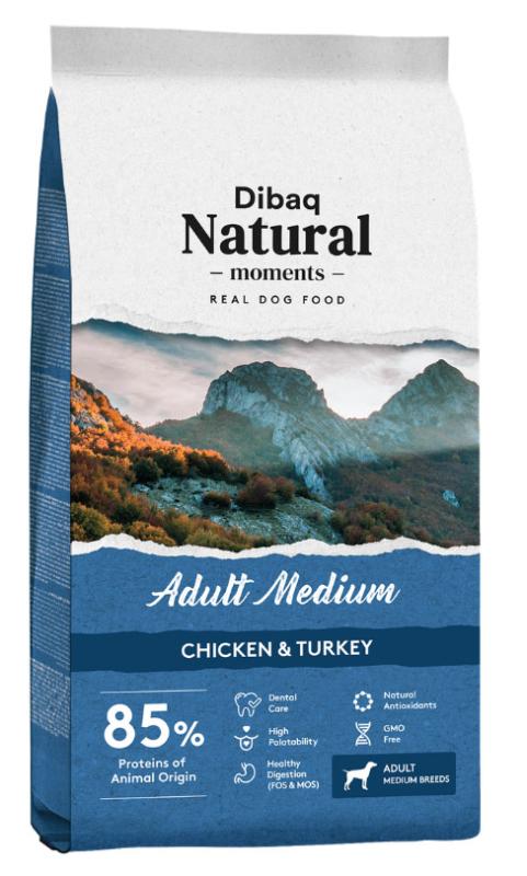 Dibaq Natural Moments Adult Medium (Курица, индейка) – натуральный корм для взрослых собак средних пород со средней физической активностью. Рецепт еды с натуральными антиоксидантами, уходом за зубами и без ГМО.
