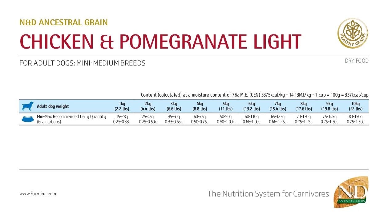 Farmina N&D Ancestral Grain Light Adult Mini (Курица и гранат) - полнорационный корм для взрослых собак мелких пород, склонных к лишнему весу.