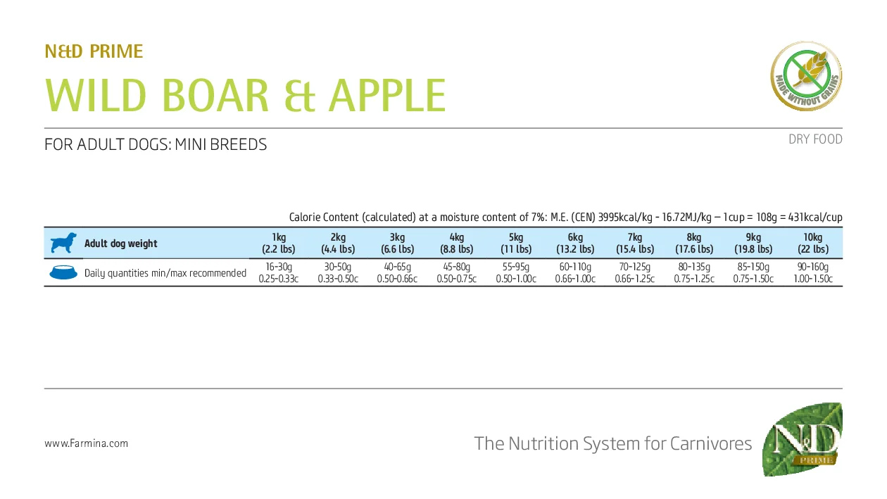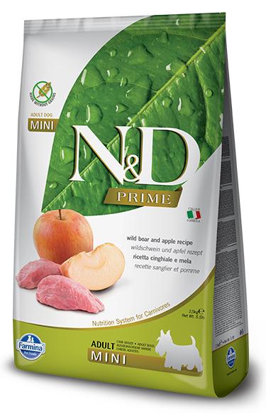 Farmina N&D Prime GF Adult Mini (Кабан и яблоко) - это полнорационный беззерновой корм, подходящий для взрослых собак мелких пород.