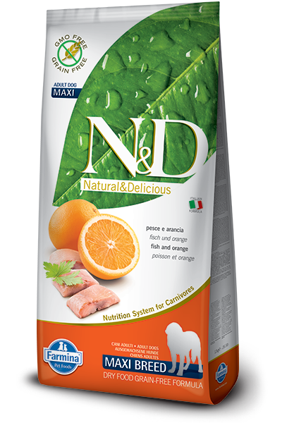 Farmina N&D GF Adult Maxi Fish & Orange (треска, апельсин) - это полнорационный беззерновой корм, подходящий для взрослых собак крупных пород.