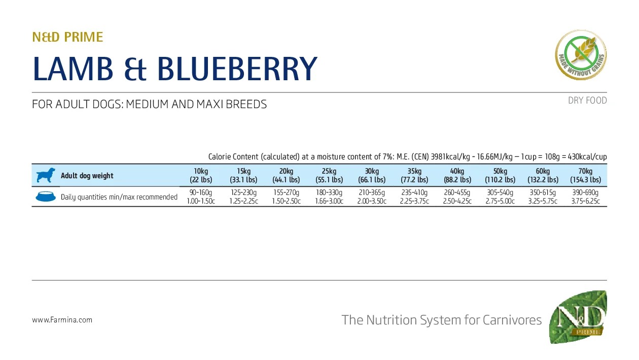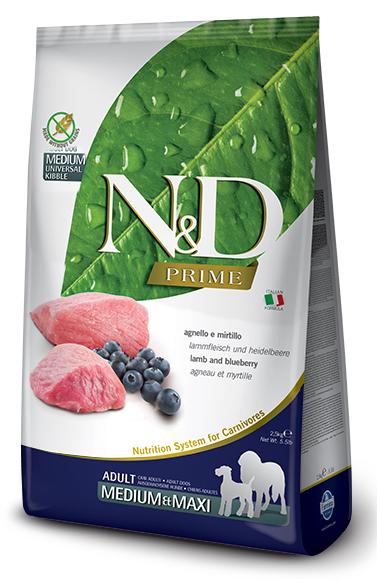Farmina N&D Prime GF Adult Medium & Maxi (Ягненок и черника) - полнорационный беззерновой корм для взрослых собак.