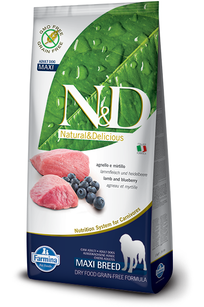 Farmina N&D GF Adult Maxi Lamb & Blueberry (ягненок, черника) - это полнорационный беззерновой корм, подходящий для взрослых собак крупных пород.