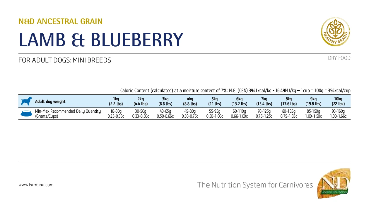 Farmina N&D Ancestral Grain Adult Mini (Ягненок и черника) — полнорационный корм для взрослых собак мелких пород с низким содержанием зерна.