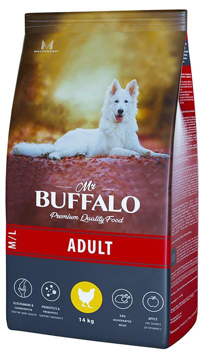 Mr.Buffalo Adult M/L (Курица) - полнорационный сухой корм с курицей для взрослых средних и крупных пород. Оптимальное содержание белков, жиров и углеводов делает этот корм подходящим для собак средних и крупных пород. Именно на их потребности рассчитан и витаминно-минеральный премикс. Сбалансированный состав обеспечивает прекрасную форму взрослых животных, препятствуя набору лишнего веса и предотвращая заболевания суставов.