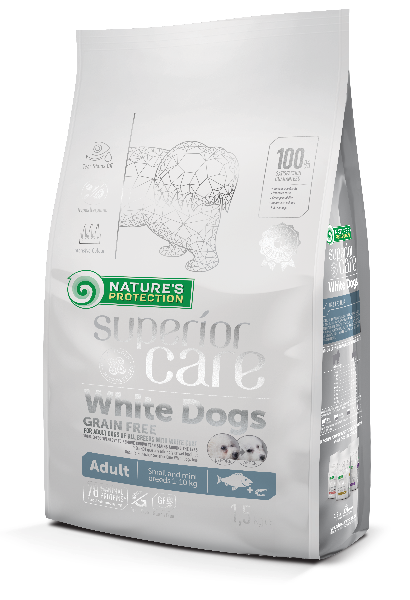 Nature's Protection SC Whitе Dogs Grain Free Small Breeds (Белая рыба) — это полнорационный беззерновой сухой корм для взрослых белошерстных и светлошерстных собак маленьких и очень маленьких (1-10 кг) пород с белой рыбой.