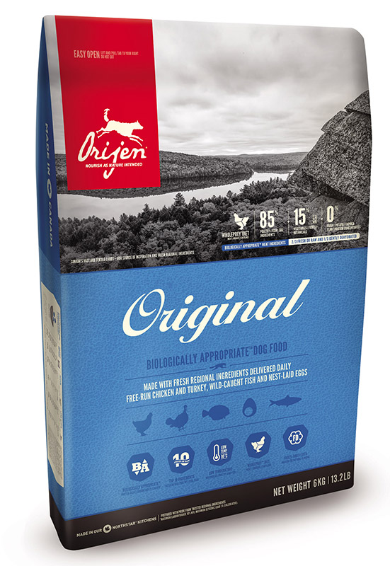 Для максимально близкого соответствия природному рациону питания собак в корме ORIJEN - 85% состава приходится на следующие ингредиенты: мясо домашней птицы, яйца и рыба. Благодаря столь высокой насыщенности мясными ингредиентами обеспечивается биологически соответствующий уровень содержания белков (38%). В природном рационе питания собак содержится мало углеводов и злаков. Именно поэтому в составе корма ORIJEN злаки полностью отсутствуют, а количество углеводов снижено приблизительно вдвое по сравнению с традиционными кормами для домашних животных и составляет необходимый минимум (19%). В корме также отсутствуют картофель, тапиока и гмо-компоненты.