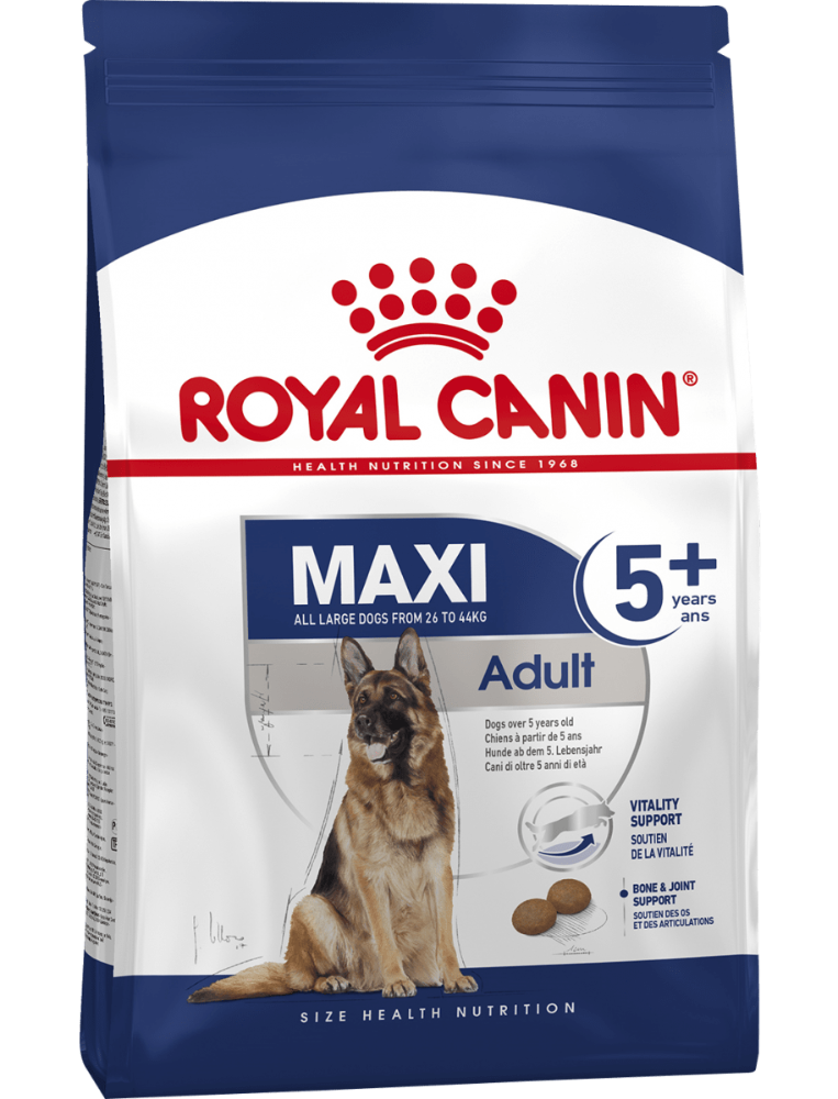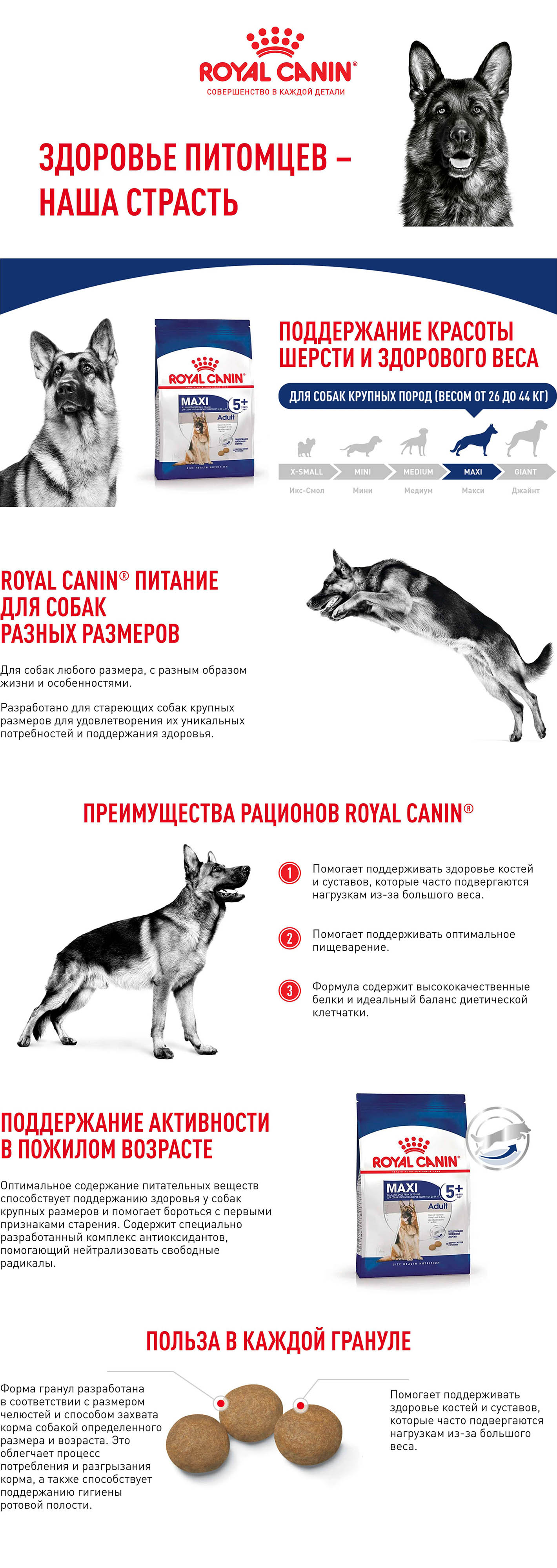 Royal Canin Maxi Adult 5+ - полнорационный сухой корм для стареющих собак крупных размеров (вес собаки от 25 до 45 кг) в возрасте от 5 до 8 лет. Адаптированное содержание питательных веществ помогает сохранять нормальное функционирование организма у собак крупных пород, проявляющих первые признаки старения. Содержит специальный комплекс антиоксидантов, способствующий нейтрализации свободных радикалов.
