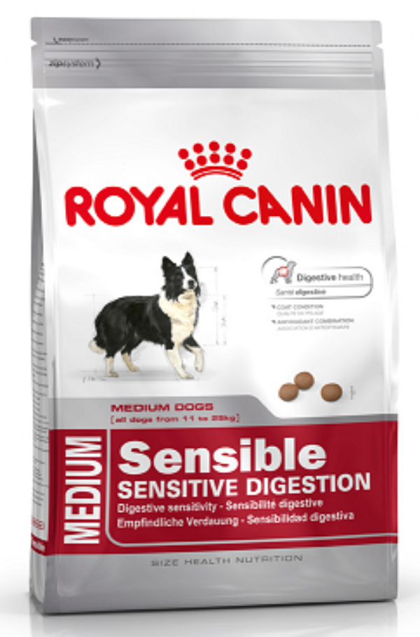 Royal Canin Medium Sensible Digestive - полнорационный сухой корм для взрослых (старше 12 месяцев) и стареющих собак средних размеров (вес собаки от 11 до 25 кг) с повышенной чувствительностью пищеварительной системы.