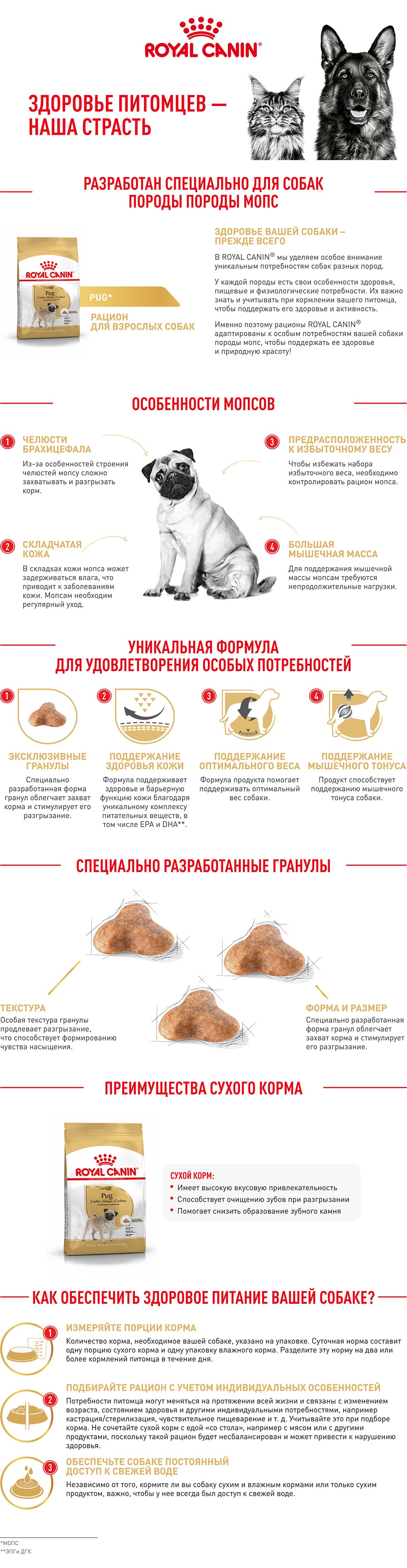 Корм ROYAL CANIN Pug Adult, предназначенный для собак породы мопс старше 10 месяцев, специально разработан с учетом уникальных потребностей вашей взрослой собаки в питательных веществах.