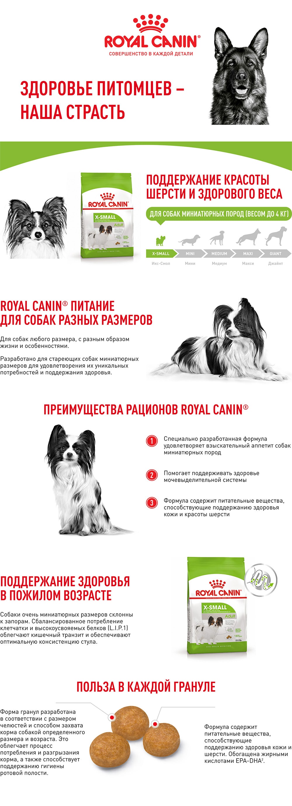 Продукт ROYAL CANIN X-Small Adult предназначен для собак миниатюрных пород старше 10 месяцев весом до 4 кг и разработан специально с учетом их потребностей в питательных веществах.