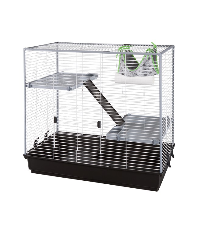 Что нужно для комфортной жизни хорька в домашних условиях? Вкусная и полезная еда, правильный уход и уютная клетка. Последнее очень важно, потому как именно там питомец будет проводить большее количество времени. Voltrega HURON 266B оборудована всем самым необходимым для комфорта питомца. Внутри установлены две платформы, соединенные удобной лестницей, где можно поиграть, полазать и отдохнуть. В этих целях можно использовать специальную трубу на боковой стенке клетки, а также уютный гамачок, подвешенный в самом верху! Что ещё нужно для счастья?