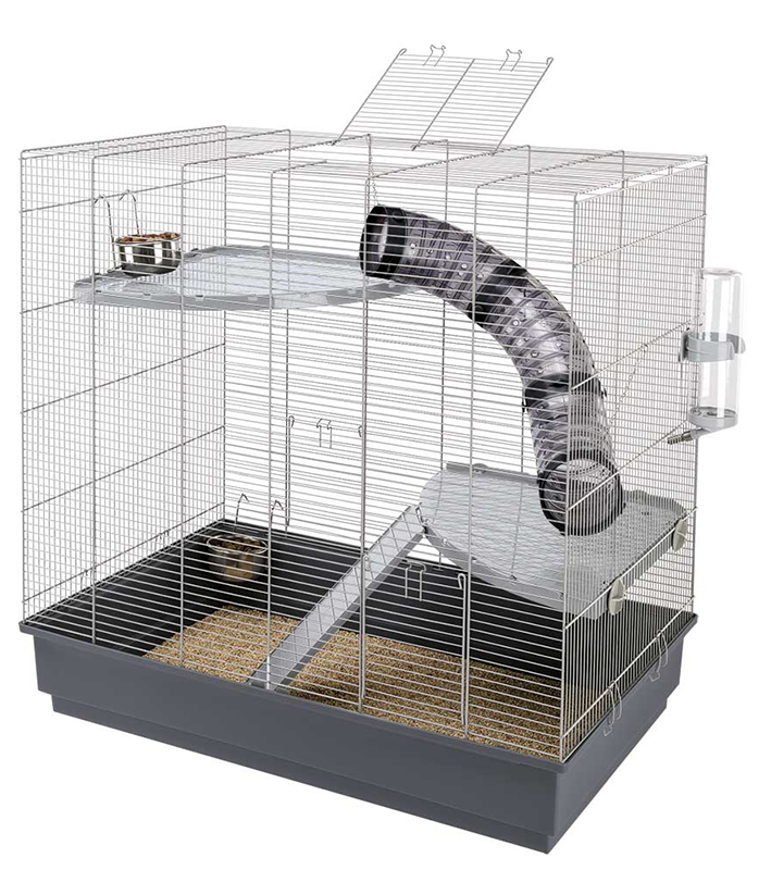 Вашему питомцу понравится исследовать все уровни клетки, состоящие из пластиковых полок, соединенных туннелями, которые также помогут поддерживать отличную физическую форму. Клетка сделана из металлической решетки с пластиковым покрытием и имеет поддон из термопластика, дверцы с безопасными замками, открывающиеся снаружи. Клетка оборудована и другими аксессуарами, такими, как поилка, пластиковая лесенка и миски из стали, прочные, гигиеничные и оборудованные крючками. Поддон легко отсоединяется от металлической решетки, что очень удобно при уборке.