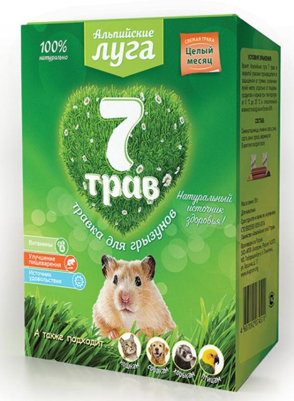 Альпийские Луга "7 трав" травка для грызунов содержит специально подобранные травы из 7 видов растений, которые нормализуют обменные процессы в организме животного, в том числе пищеварительные, являются естественным источником клетчатки, углеводов, витаминов группы В, витаминов Е, Н, РР, минералов, незаменимых жирных кислот, каротина; стимулируют процессы очищения желудка от шерсти.