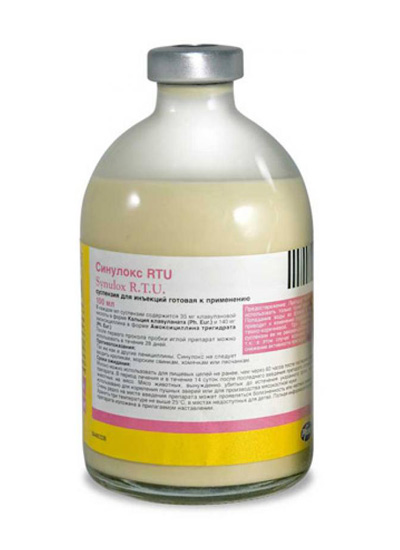 Синулокс RTU представляет собой стерильную маслянистую суспензию для инъекций светло-кремового цвета, содержащую в 1 мл в качестве действующих веществ 140 мг амоксициллина в форме амоксициллина тригидрата и 35 мг клавулановой кислоты в форме клавуланата кальция. Выпускают в стеклянных флаконах по 40 мл и 100 мл.