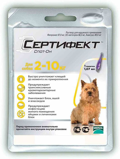 Cертифект S - это инсектоакарицидные капли ДЛЯ СОБАК весом до 10 кг. Они уничтожают уже имеющихся паразитов на всех стадиях развития, а также защищают от появления новых (от блох до 3 месяцев, от клещей до 5 недель).