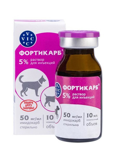 Фортикарб 5% назначается собакам для профилактики и лечения острого, хронического и бабезиоза. Защитный эффект сохраняется от 2 до 4 недель.